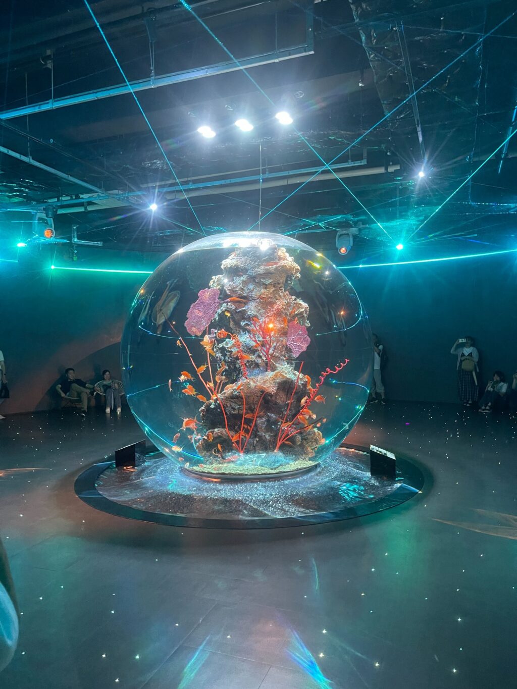 アクアリウムを核に、舞台美術やデジタルアートを融合させ、いきものの造形美や神秘性を惹きだしています。音、光、水、香り、など五感で感じる演出が幻想的で、独創的な世界への臨場感を高めています。演出時間はおおよそ20分ほどでした。