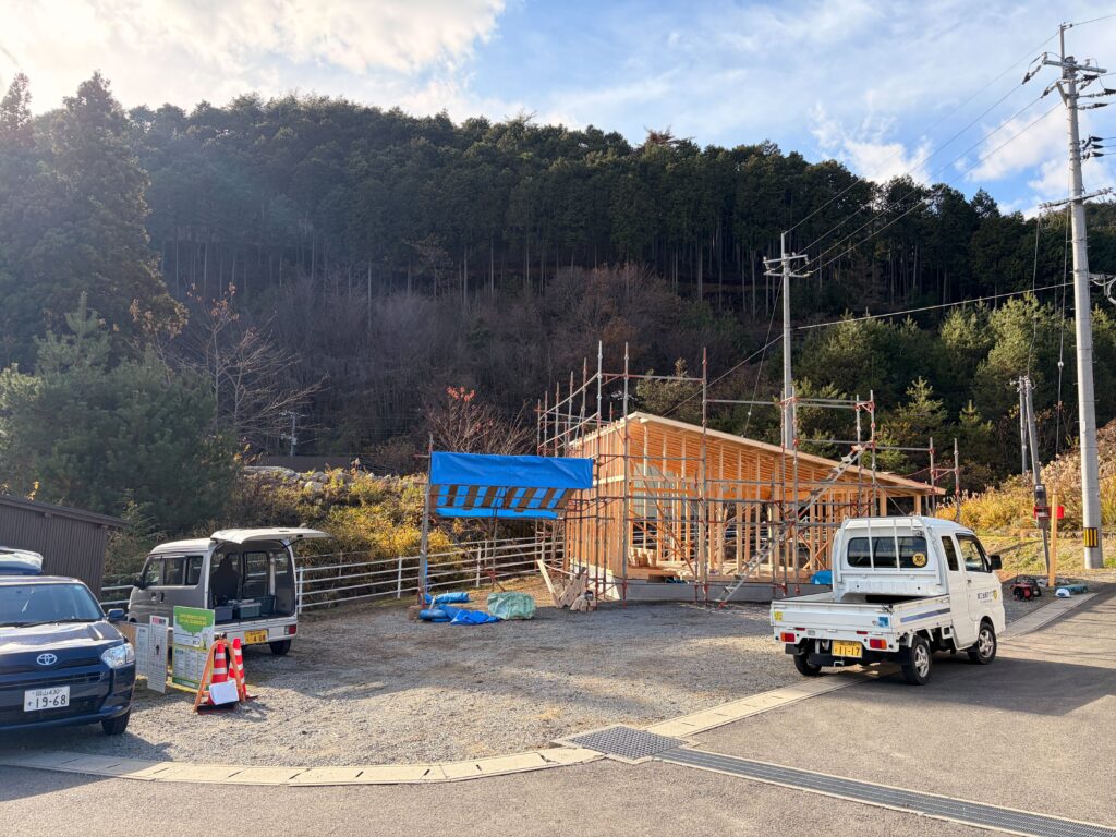 昨日は、その建て方工事が行われると聞き、西粟倉の現場を訪れました。2棟が無事に上棟し、建物の輪郭が立ち上がった姿を見ることができました。前回の単身型とは異なり、内部空間の広がりや、外部に対する開き方が今回の設計の大きなポイントとなっています。