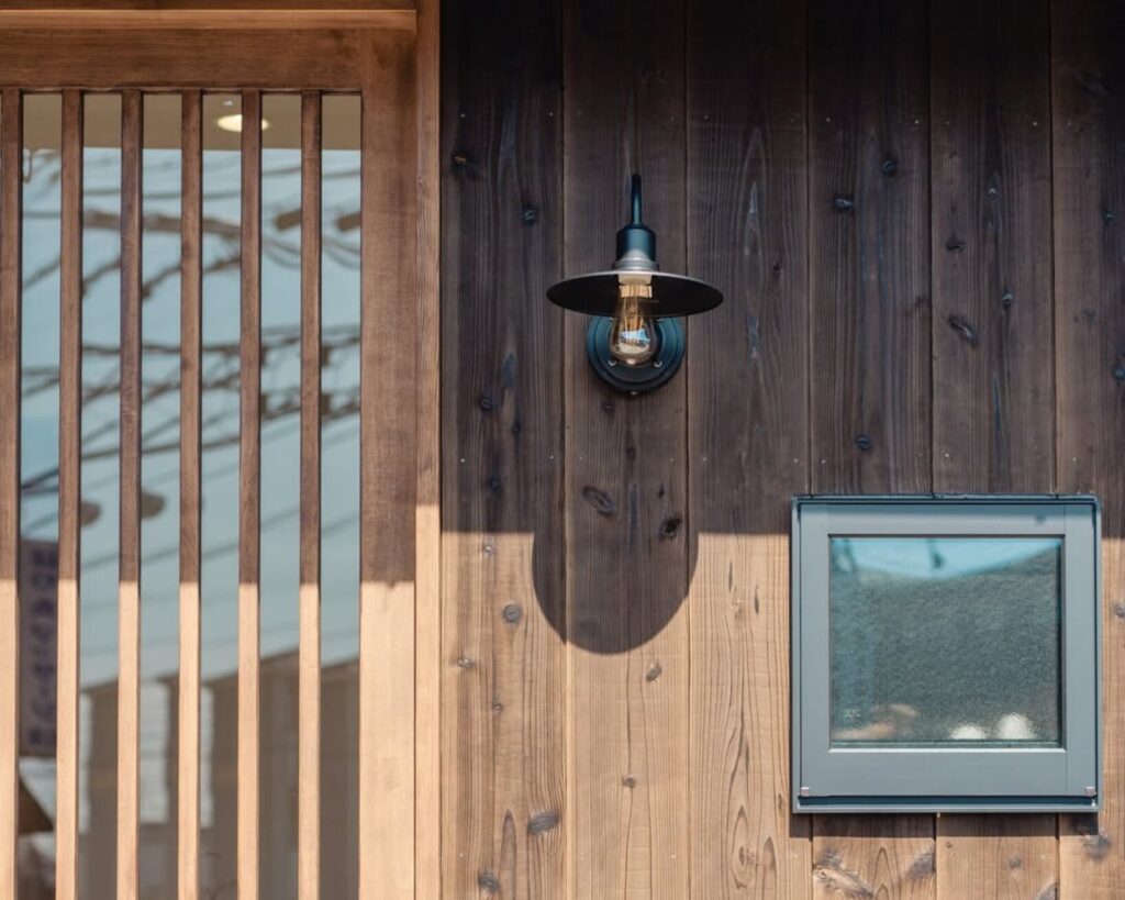 ・木の外壁 × ブラックのポーチライト