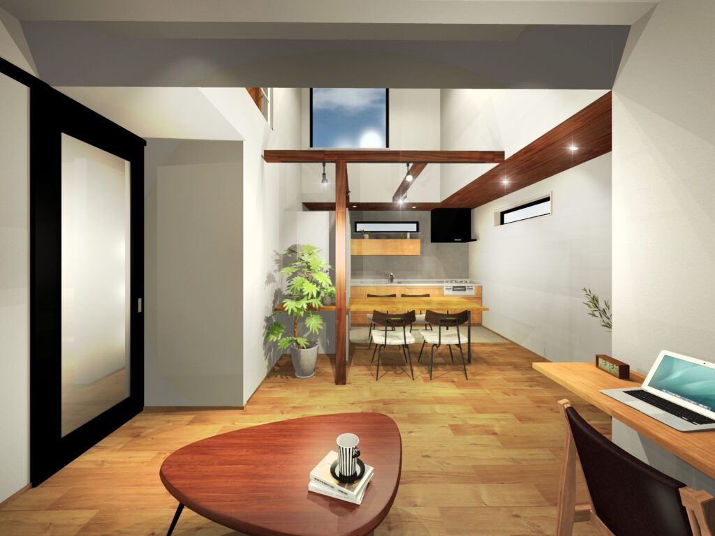 元々は吹き抜けがない、2階建のお家でした。LDKに光を取り入れ開放的な空間に。立派な梁も生かしながら、デザイン性も忘れないようパースを作成しました。