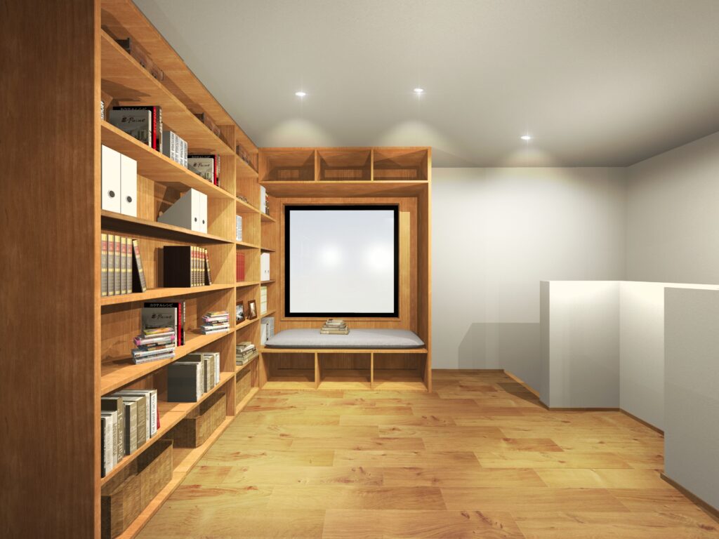 こちらは、同じお家の2階のヌックのスペース。ヌックの大開口の窓、右側にももう一つ窓があり光がたっぷり入る家族のフリースペースです。ここで好きな本を手に取って過ごす時間を思い浮かべながらつくりました。