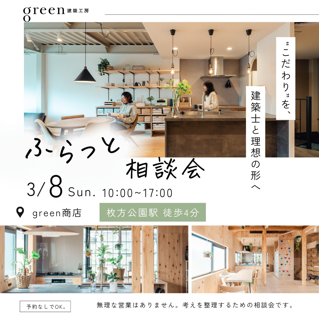 ※3/8は五六市開催中ですが、green建築工房にて相談会がある旨を警備の方にお伝えいただくと車での通行が可能です。