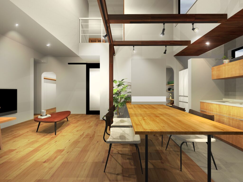 吹き抜けは空間全体に自然光を届けるだけでなく、家中に風が流れる動線を作ります。