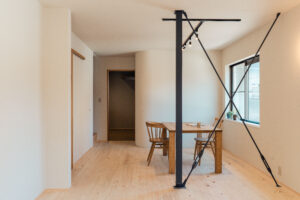 無理に隠さず、鉄骨をあらわしにすることで、素材感を活かしたスタイリッシュな空間に仕上げています。