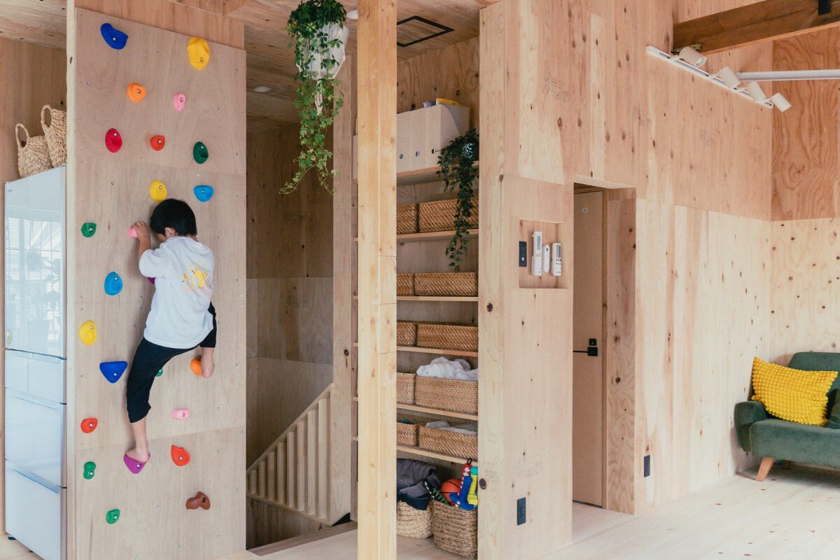 このお住まいでは、子どもが家の中でものびのび遊べるようにボルダリングウォールを設置。