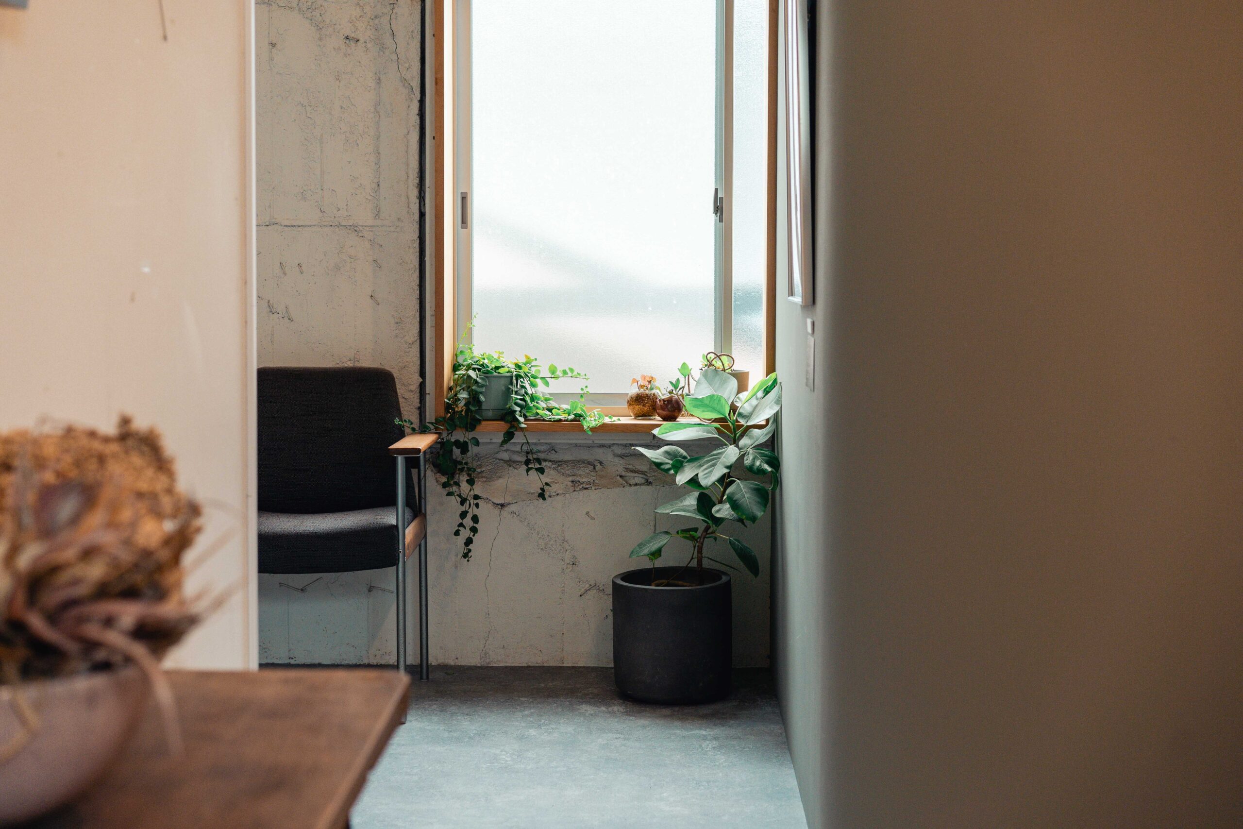 床は、かつて敷かれていたカーペットを剥がし、現れたコンクリート下地をそのまま仕上げとして活用。素地のままの素材感を生かすことで、静けさの中にどこか力強さのある空間となっています。