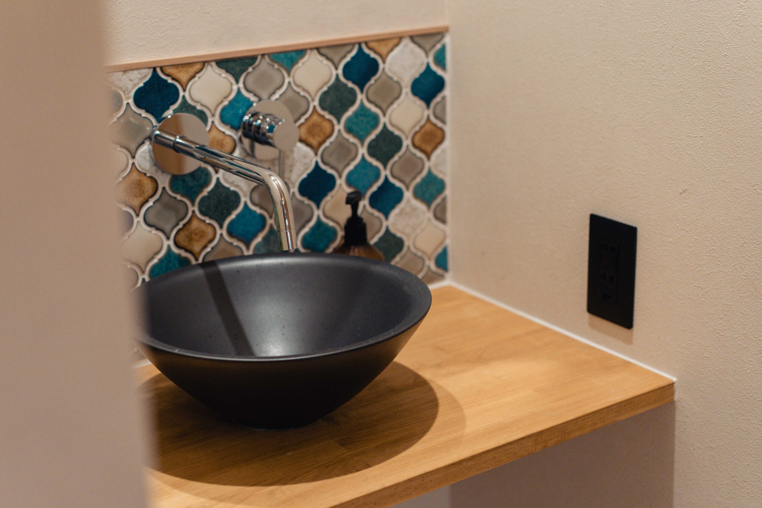 洗面スペースには造作カウンターと六角タイルを取り入れ、機能性の中にさりげない個性を添えています。
