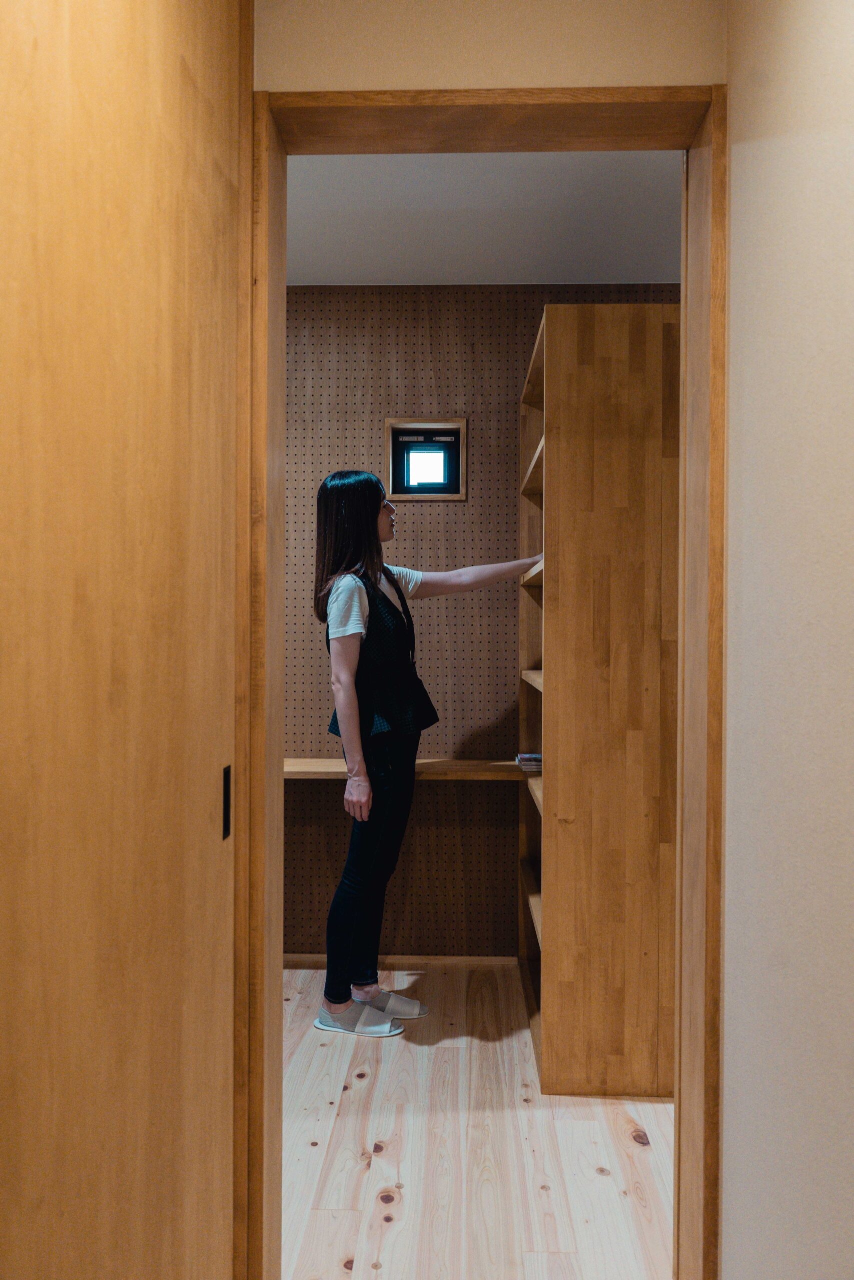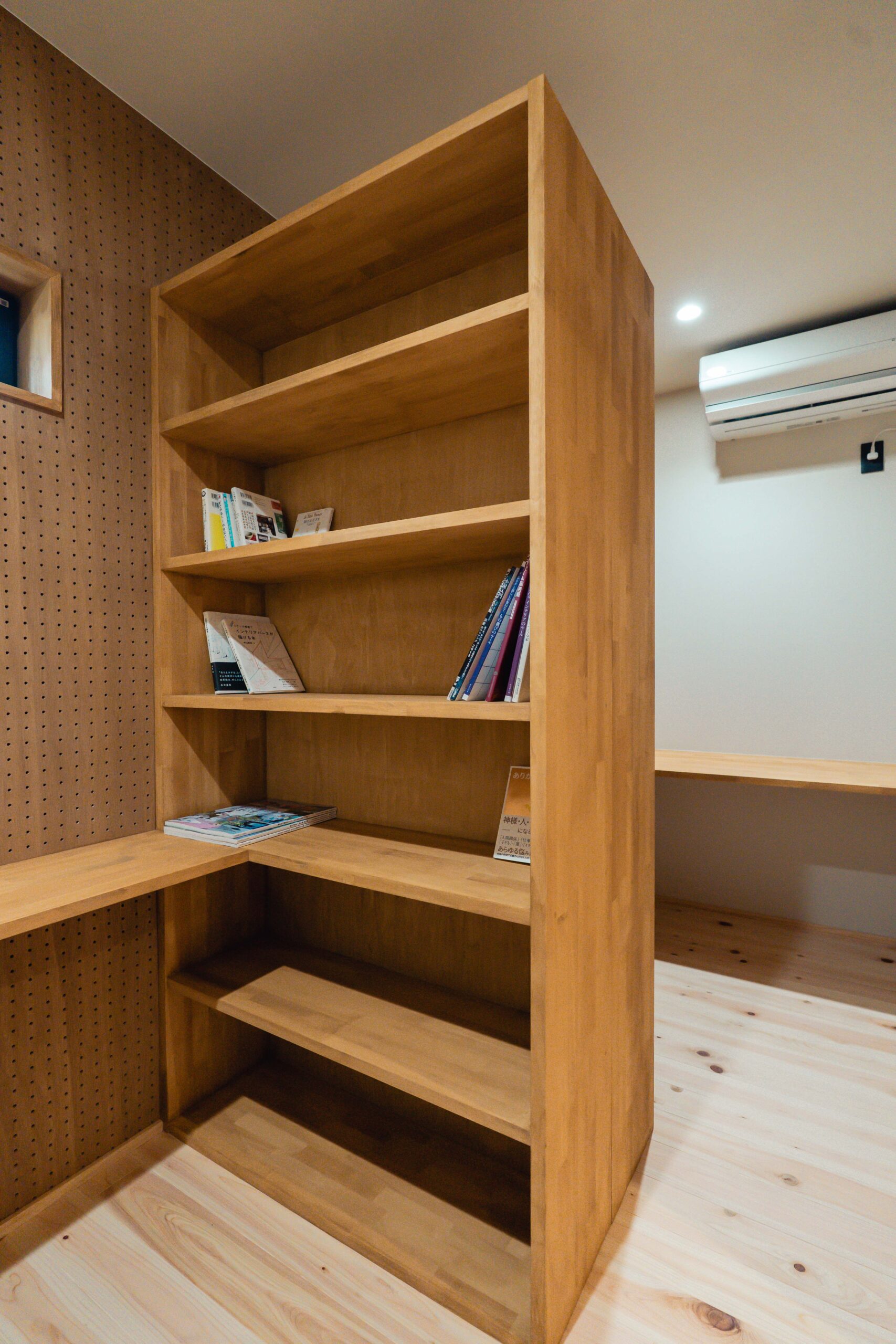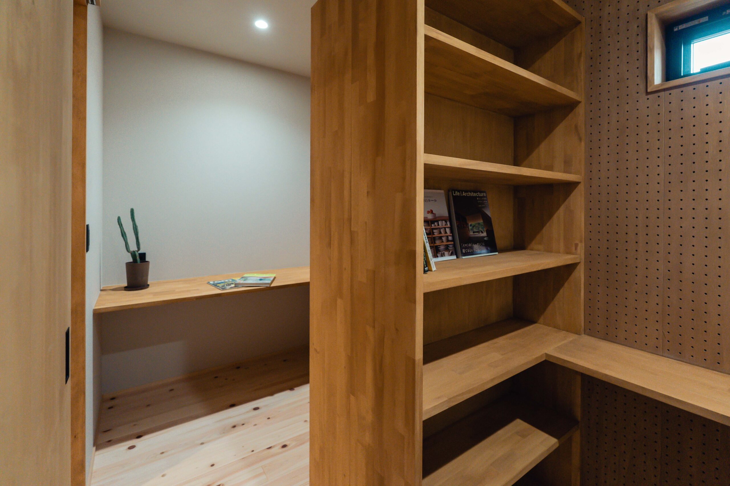 書斎は2つの空間を隔てるように造作本棚を設け、それぞれが仕事や趣味に集中できる落ち着いた空間としました。